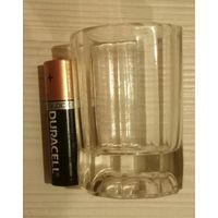 Лафитник в виде пивного бокала. Высота ~5 см, низ ~3.5см, верх ~4 см. Обьем ~50 грамм. 11 граней внизу. Клеймо - 20.